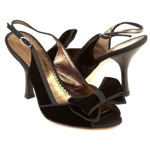 BCBG *Zahida* velvet evening shoes. Heel strap. Graphite-tone buckle. Decorative bow and needle stitch detail. Peep-toe design. Satin trim. Stacked heel. Leather lining. Leather sole.