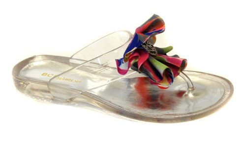 The Maddox Sandal from BCBGirls is a fun jelly flip flop topped off with oversized floral embellishment and the glitter of a rhinestone logo charm.