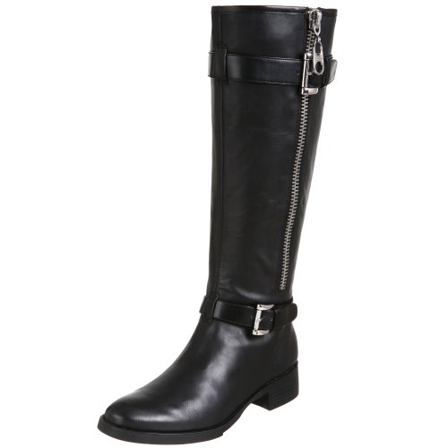BCBGirls *Moca* leather knee-high boots. Pull-on style. Partial side-zip closure. Silver-tone buckle. Decorative straps. Faux zipper decoration. Monogram detail on hardware. Silver-tone hardware. Rounded toe design. Stacked heel. Cushioned insole. Non-slip, man-made sole.