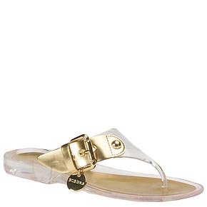 Clearly fashionable, the BCBGirls "March" Sandal is a beachy casual sandal with shining logo details and a bright buckle.