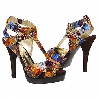 The dramatic BCBGeneration Devona T-strap sandals will bring voluminous style to your outfit. Snake-embossed or metallic leather upper in a platform dress sandal style with a round peep toe. Cutout leather vamp and instep straps lace through a matching center T-strap, ankle strap with adjustable metal buckles. Smooth lining and cushioning footbed. Flat traction outsole. 3/4 inch platform midsole and 4 1/4 inch heel.