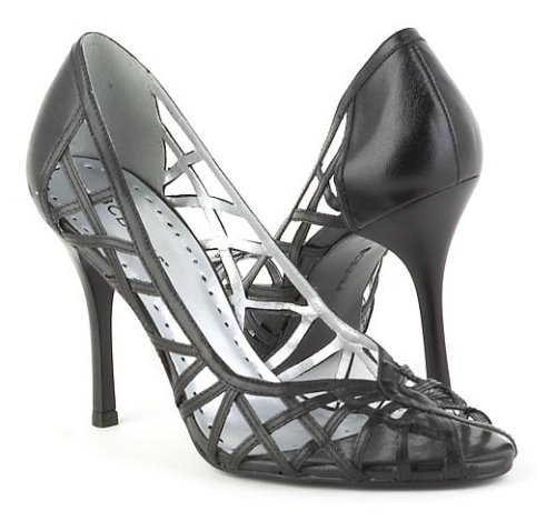 BCBGirls *Doble* leather heels. Decorative cutout and needle stitch detail. Woven design. Peep-toe design. Man-made stiletto heel. Cushioned insole. Leather sole.