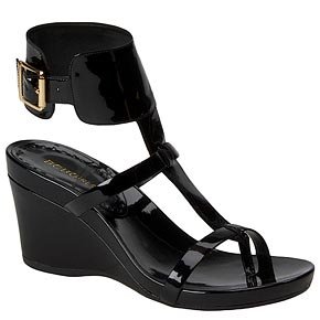 Jump in to the "Airone" Wedge from BCBGirls and buckle up! The oversized ankle strap and buckle contrasts beautifully with chic, slim lines of the t-strap vamp and shapely wedge heel for an edgy, polished fashion look.