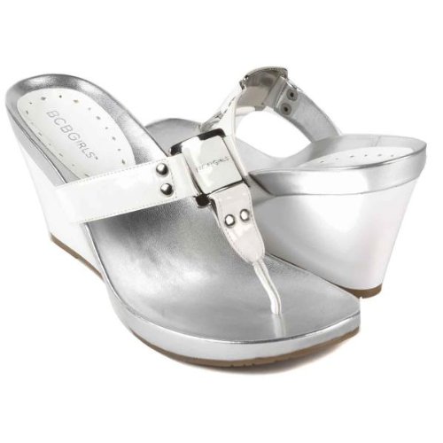 Elevate your profile in this sleek and versatile thong sandal from BCBGirls. Silver-toned metal studs and a lacquered logo detail adorn the patent or smooth synthetic upper, and a rounded thong post rests comfortably between the toes. With its curvy shape and matching wedge heels, the Yardley adds an unexpected bit of flair to conservative and work apparel and is a perfect match with casual skirts and dresses.