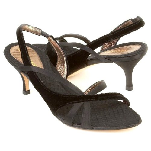 BCBG *Admin* velvet evening shoes. Elastic heel strap. Decorative cutout detail. Decorative straps. Open toe design. Satin trim. Covered heel. Leather lining. Leather sole.