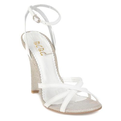 BCBG Paris *Dobee* leather wedges. Ankle strap. Graphite-tone buckle. Needle stitch detail. Decorative straps. Metallic finish. Open toe design. Fabric trim. Covered heel. Cushioned insole. Covered midsole. Man-made sole.
