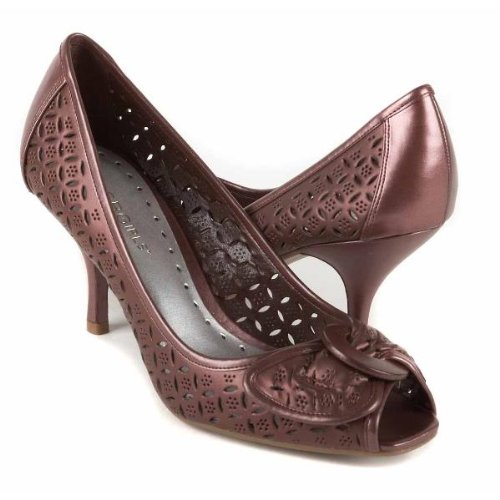 BCBGirls *Darren* leather pumps. Decorative cutout and needle stitch and Decorative ornament. perforated and decorative strap detail. Peep-toe design. Pearlized finish. Cushioned insole. Leather lining. Non-slip, man-made sole.